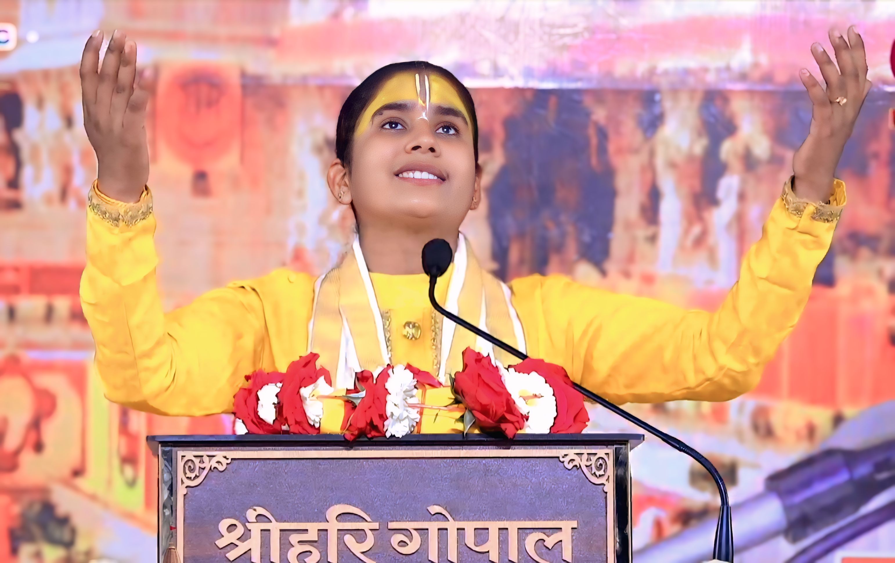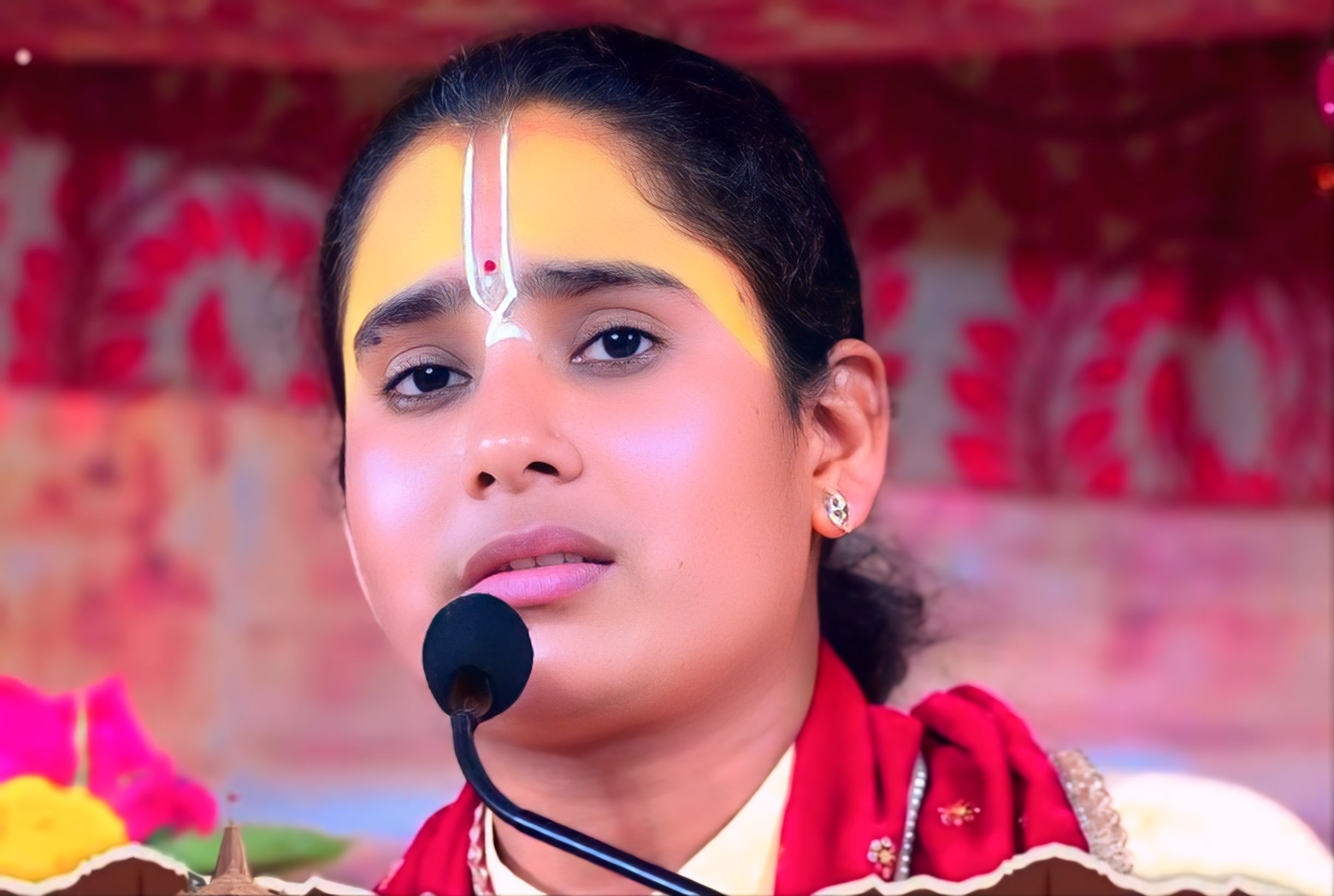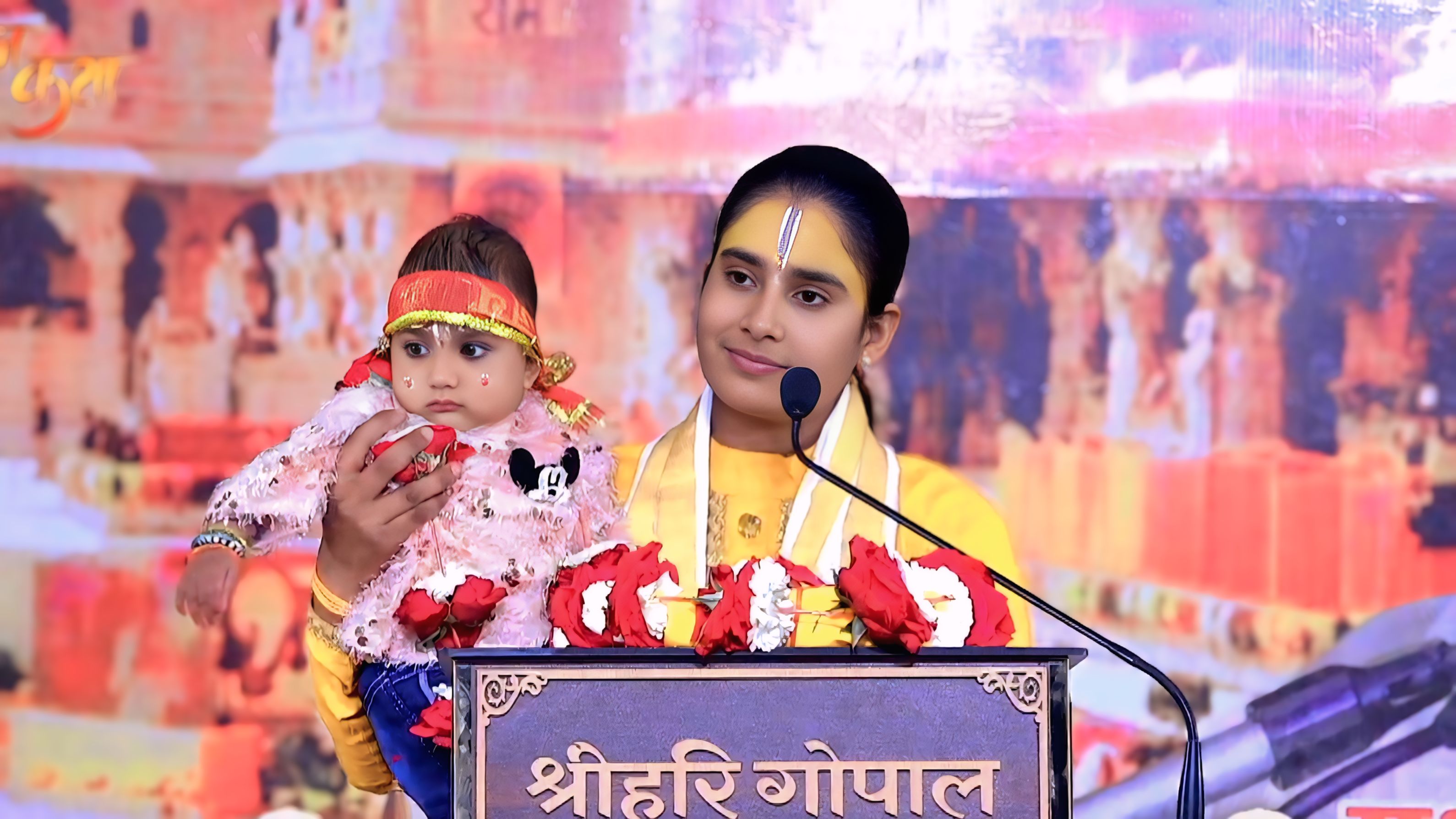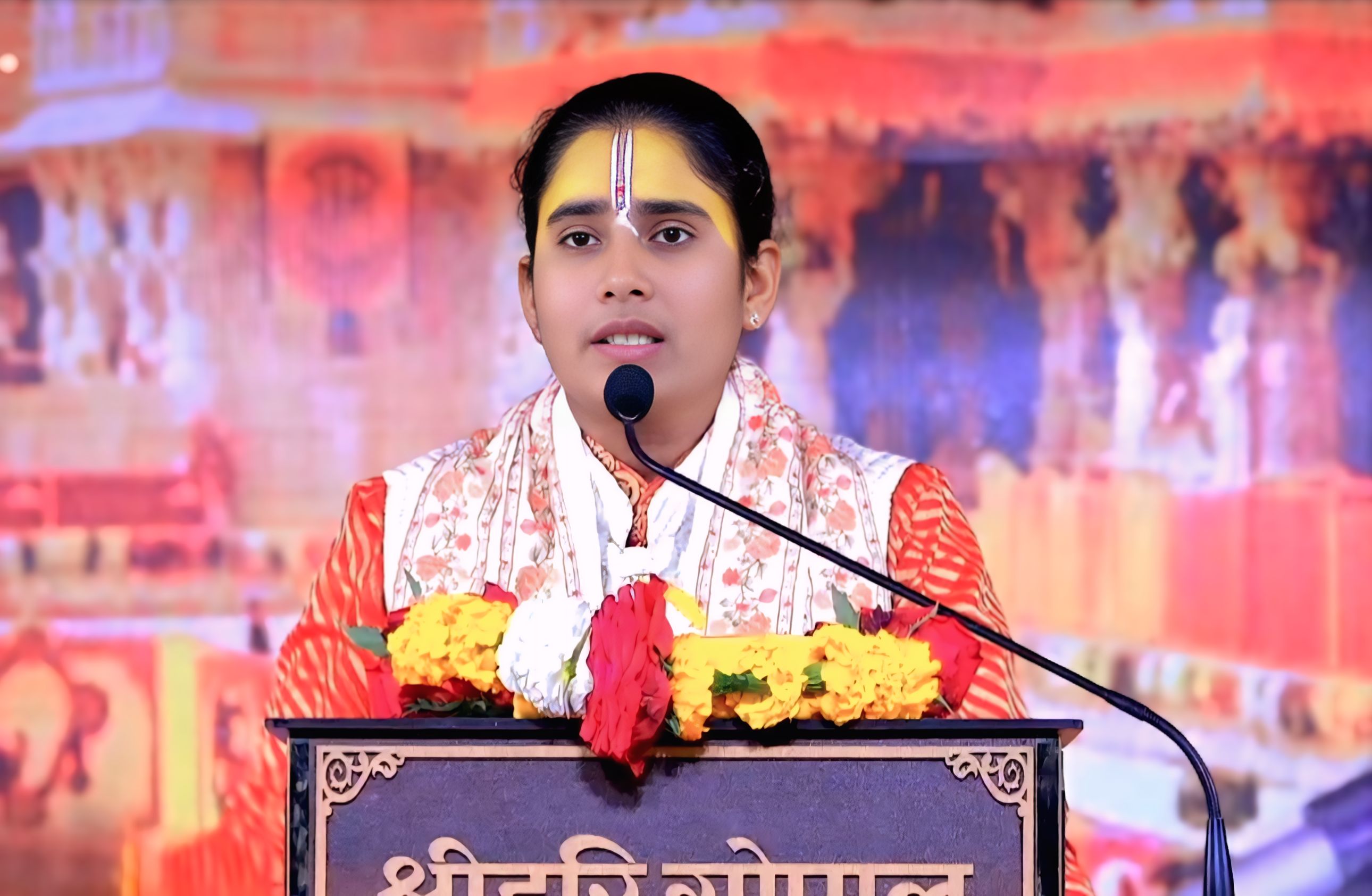 भव्य एवं दिव्य श्रीराम कथा में पूजनीय देवी जी को पुष्प गुच्छ भेंट कर स्वागत करते वन एवं पर्यावरण मंत्री राजस्थान सरकार श्री संजय शर्मा जी